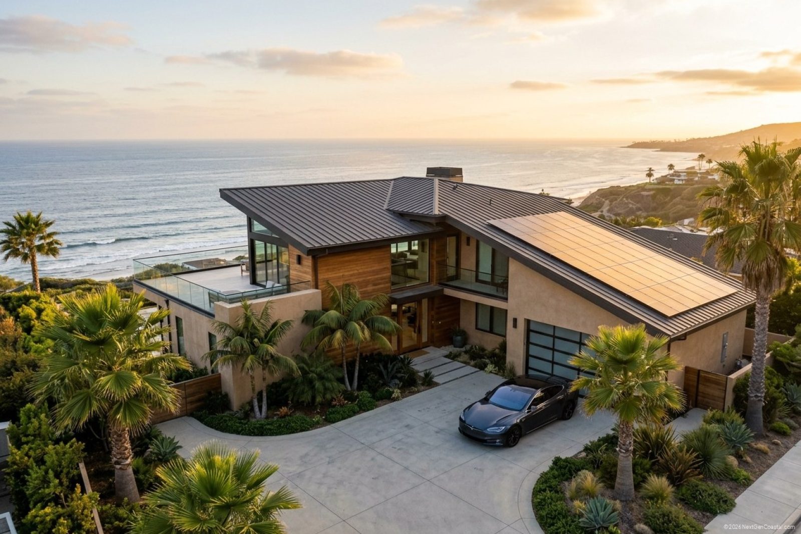 Editorial wide exterior of a contemporary coastal California single-family rental at late afternoon, with a clean rooftop solar PV array catching the warm sun, palm trees flanking the driveway, ocean glittering far in the background. Warm golden-hour palette, photorealistic, no labels, no text on the panels.